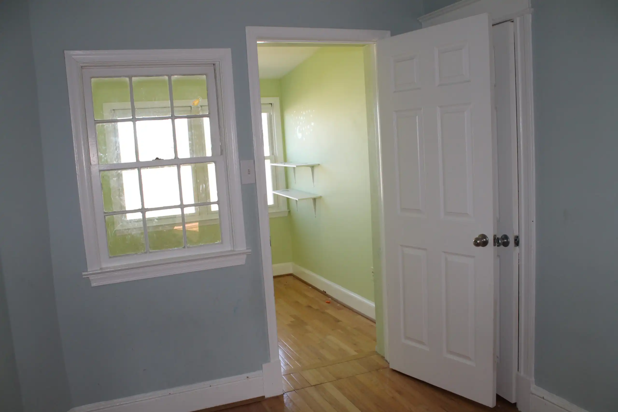 - open up the odd doorway in one secondary bedroom and add additional closet space, and add a new closet and glass door for additional light in the other bedroom