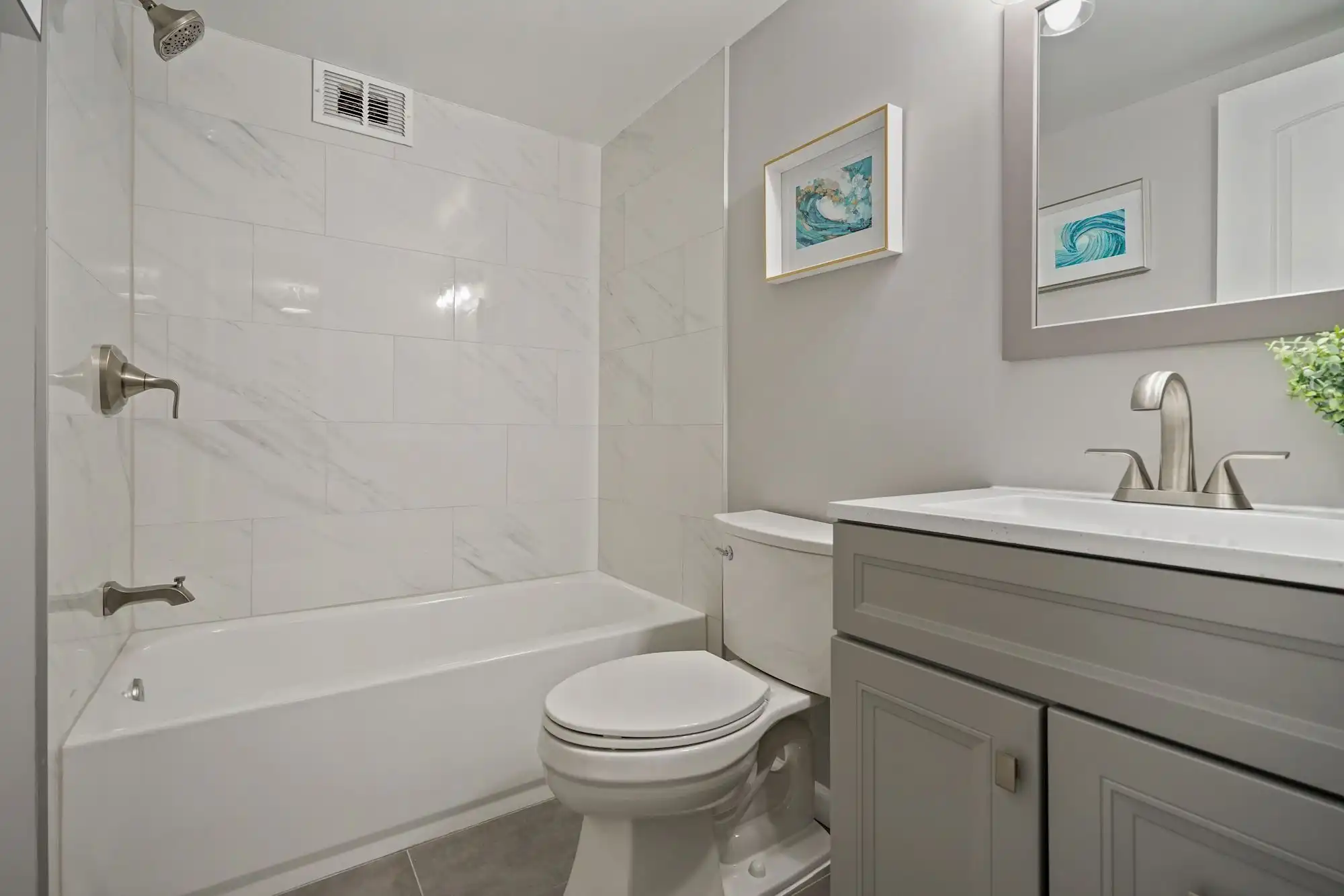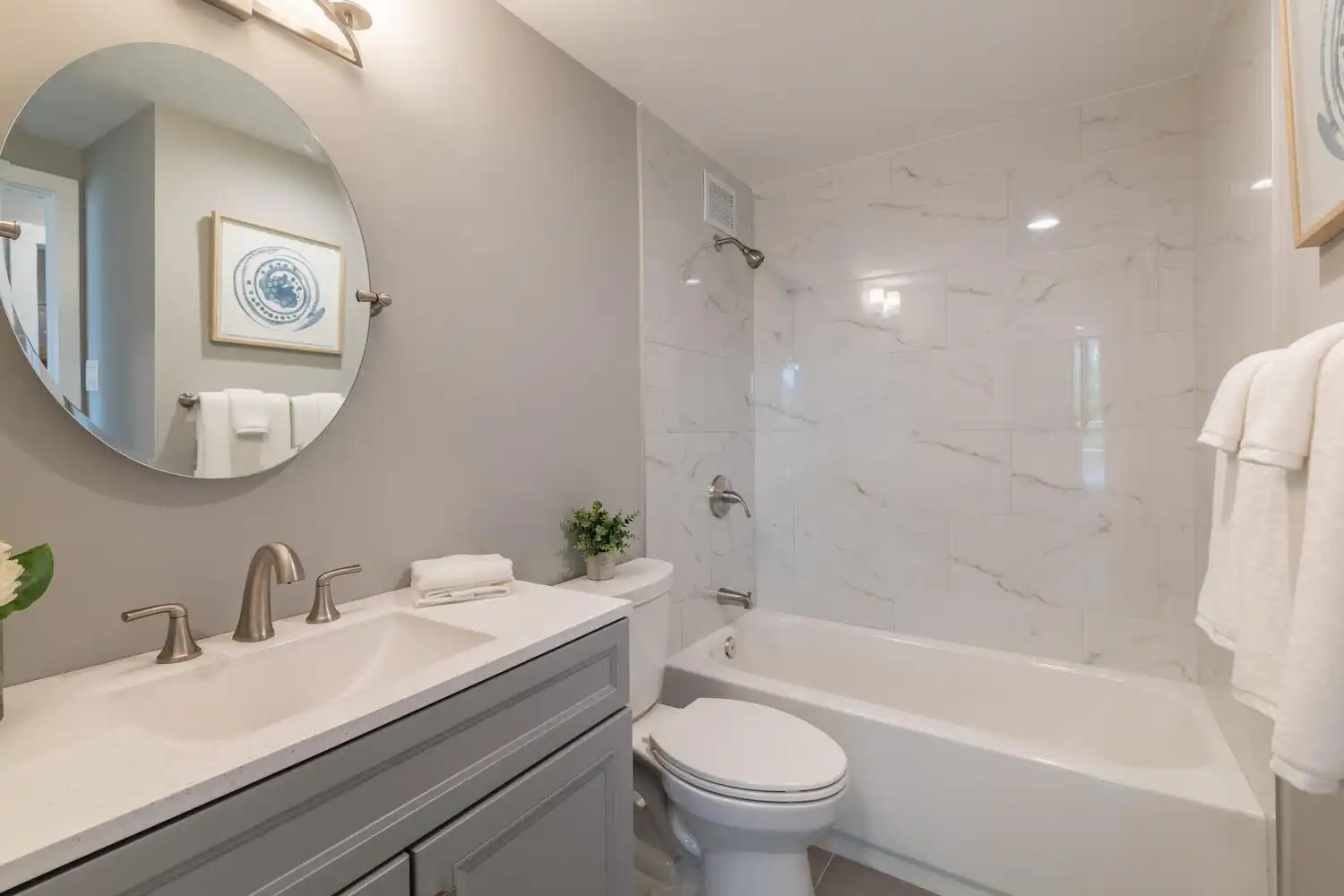 The bathroom was renovated with a more modern ceramic tile, a new tub, new fixtures, and a different vanity, light, and mirror to create an open space and a light and airy feeling. Even the toilet was replaced. The team installed new shelving in the walkthrough closet in the bedroom. New flooring and paint provided a refresh for the bedroom along with new lighting.