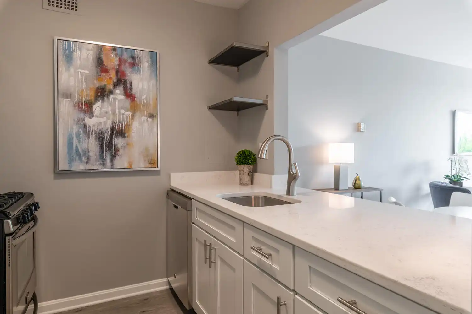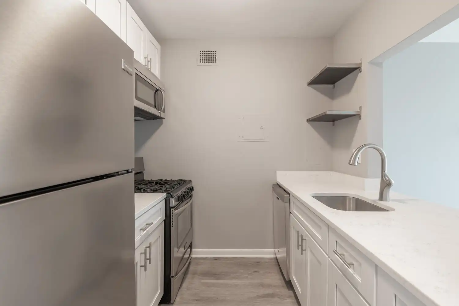 The condo was completely renovated with upper cabinets replaced in the kitchen and new doors and drawer fronts installed on the lower cabinets. The team didn’t upgrade the appliances, but they chose a quartz countertop that added a touch of sophistication. They had a new faucet installed with new shelving on the walls to maximize storage.