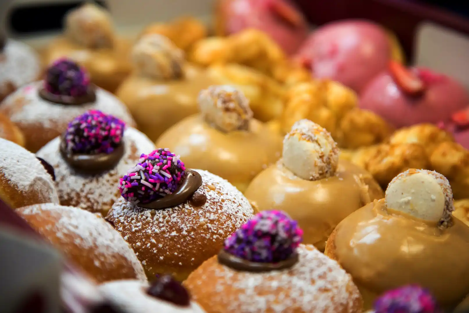 But there is another sufganiyot that must be mentioned. In recent years, just like donuts in The United States have gone upscale, sufganiyot has morphed into an even more decadent treat. These “new” sufganiyot mix fillings like chocolate ganache, passionfruit jelly, and meringue. The beautiful, upscale creations were first popularized by the Israeli chain Roladin, and they are gorgeous.