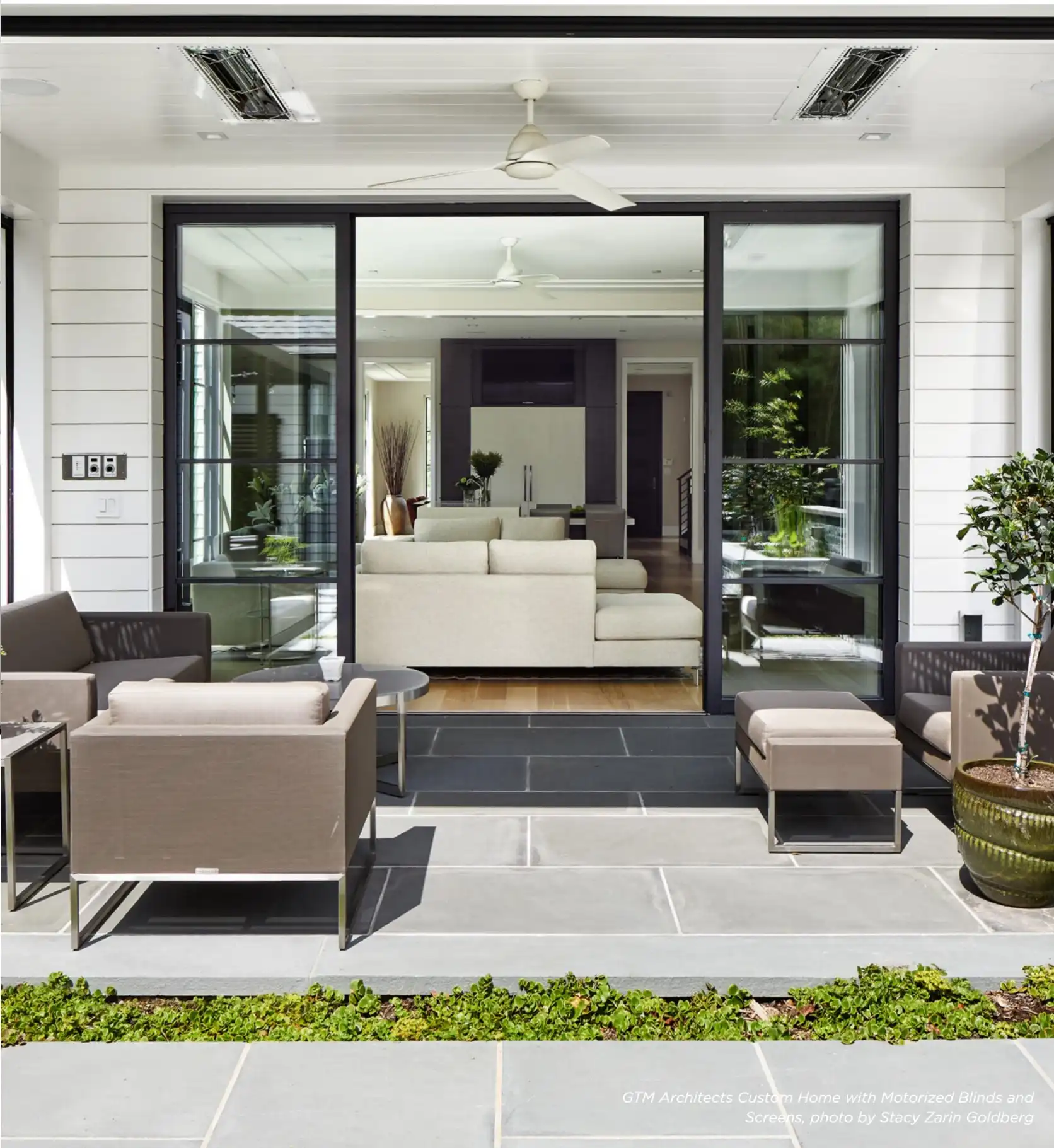 “We’ll ask about motorized shades/blinds/screens pretty early on as we often need to plan for them in the framing of the house,” says Olson. For motorized blinds, Olson says he often uses Lutron or Hunter Douglas, but has also started using J Geiger, as well as motorized screens by Phantom Screens or Fenetex.