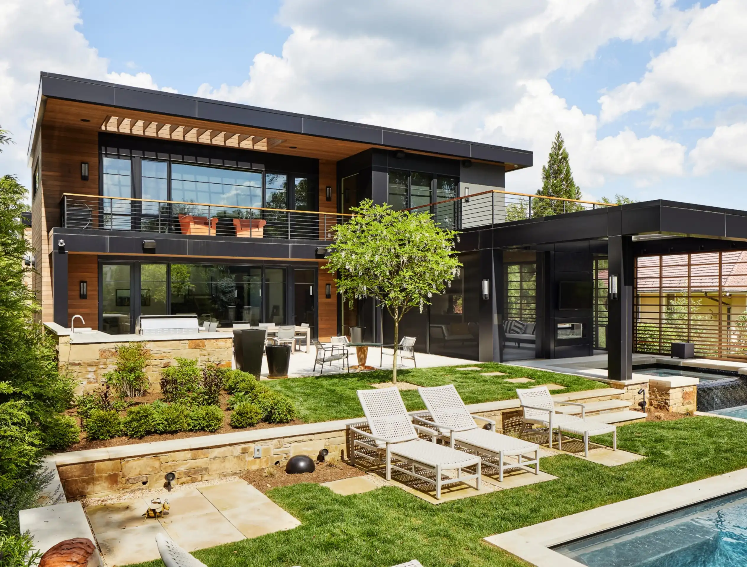 Among the outdoor tech items are speakers, mechanized screens, electric heaters, solar panels with metering to track savings and production, and light sensors controlling sunshades, says Kaufman, who also mentioned pergolas with mechanical louvers that can adjust throughout the day.
