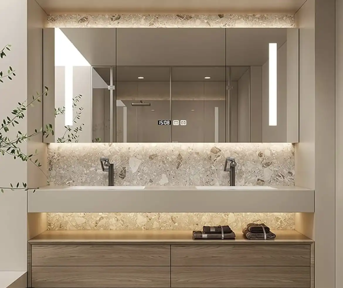 Lighting is one of the most important elements in designing a calm bathroom. Make sure to skip harsh downlights. Instead, layer the lighting. Use wall sconces, backlit mirrors, and dimmable ceiling fixtures to create a tranquil glow.