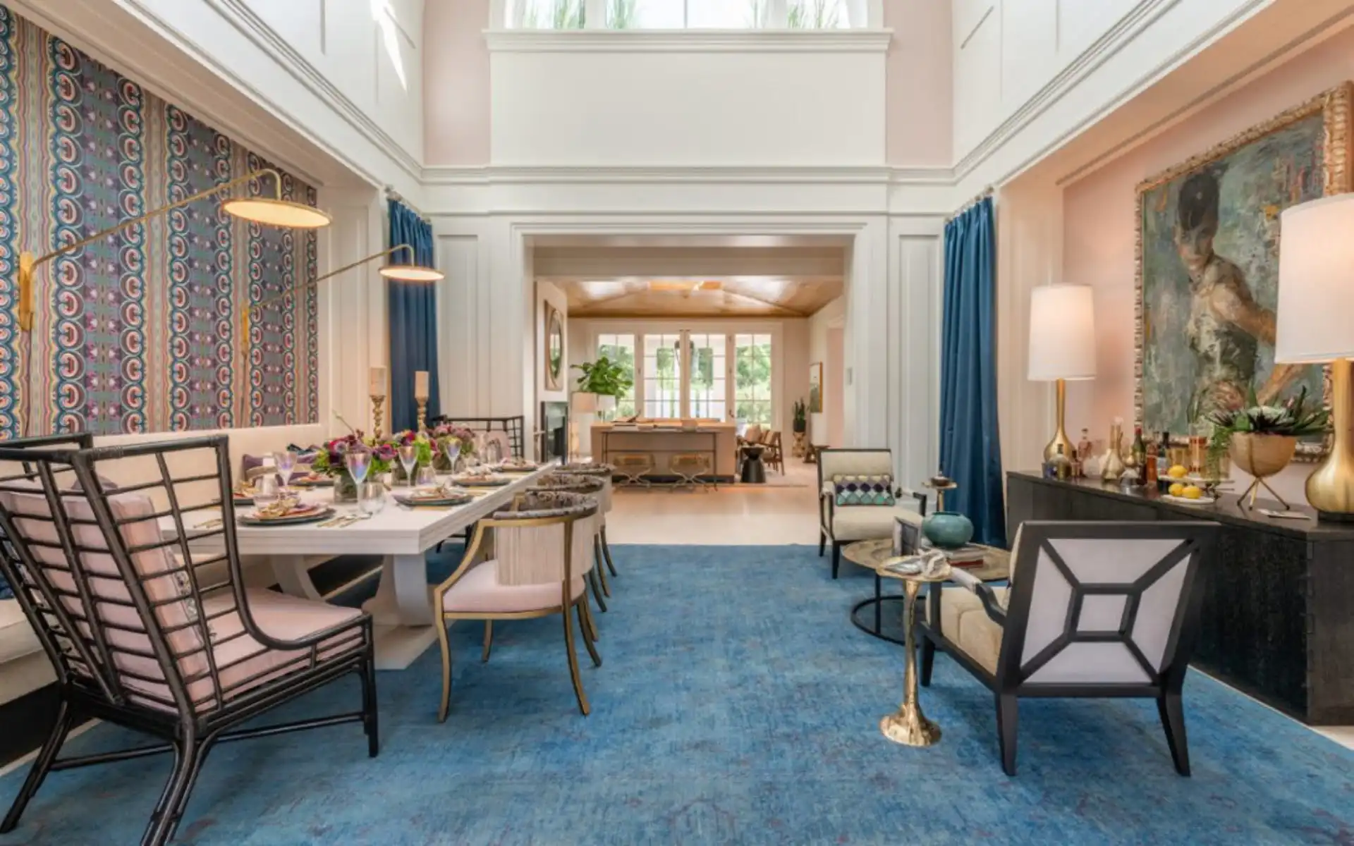 Our editors noticed this emerging trend firsthand at this year’s Kips Bay Decorator Show House Dallas. Corey Damen Jenkins transformed a tired formal dining space into an inviting, vibrant place to dine, entertain, study, and play. Having two tables ensures intimate conversation can be had or the day’s studies can be left on one table when dinnertime comes while cozy table lamps create an ambient glow that can keep the party going all night long. And while this space is certainly formal, pops of modern art, a vibrant color palette, and plenty of texture prevents any notion of stuffiness.
