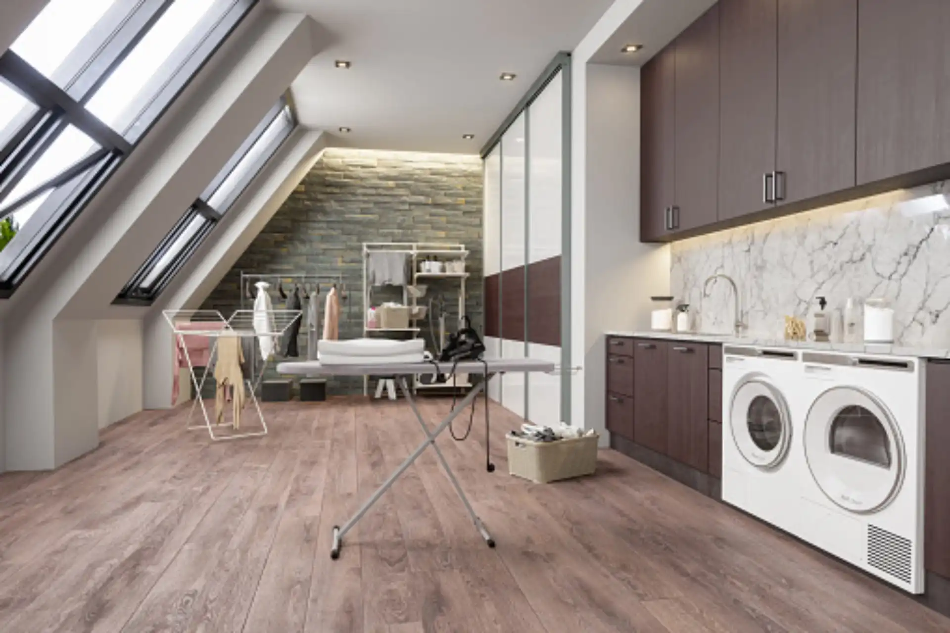 Aside from painting, the walls of your new laundry room will also need attention. Don’t be nervous to put up a large print or a large clock for decor. Add cabinets and shelving. If you do add shelving, play around with the brackets. Add gold or silver or bronze brackets to provide subtle accents. Just make sure not to ignore your walls, they can seamlessly tie everything together.