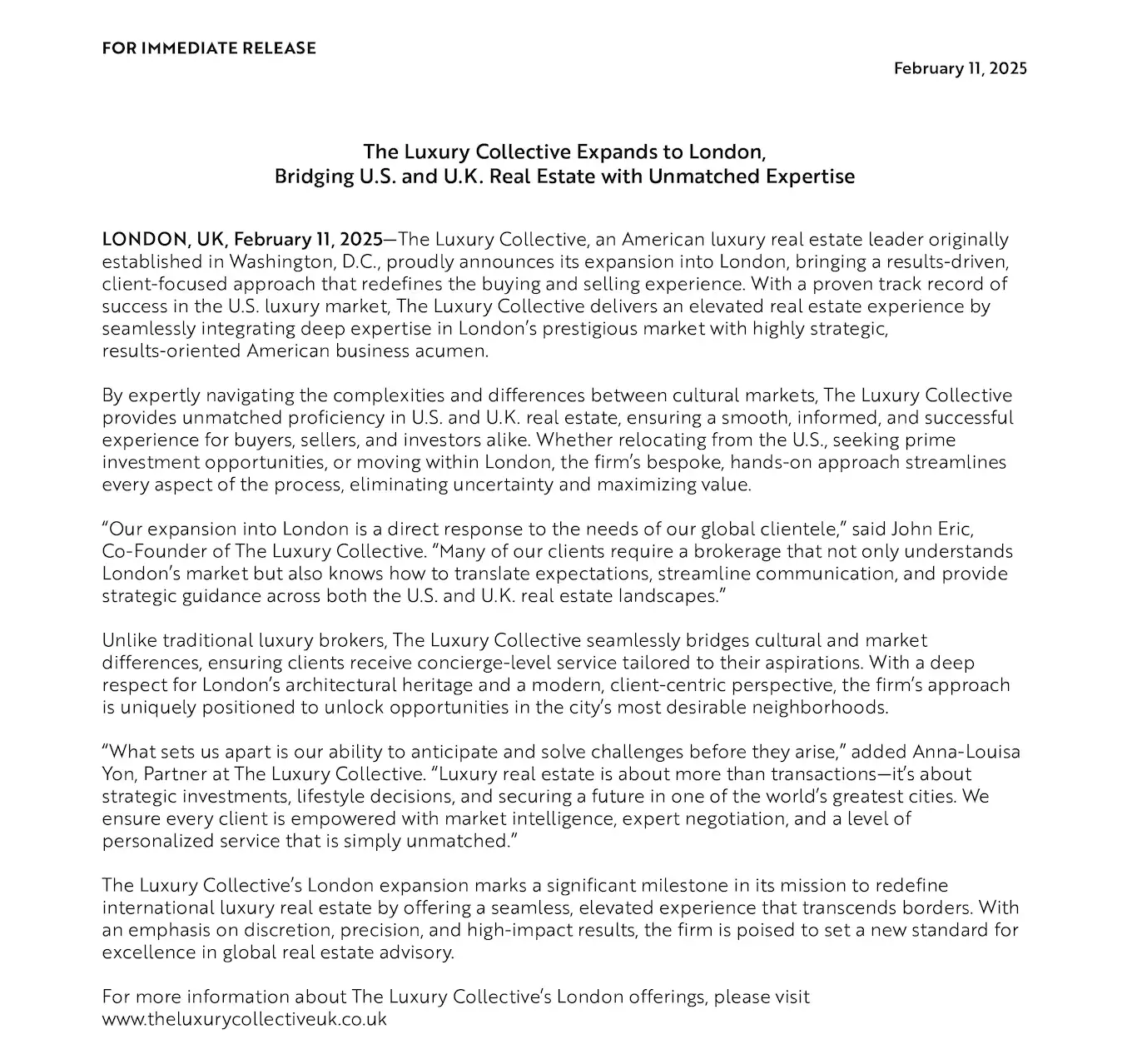 "Our expansion into London is a direct response to the needs of our global clientele," said John Eric, Co-Founder of The Luxury Collective. "Many of our clients require a brokerage that not only understands London's market but also knows how to translate expectations, streamline communication, and provide strategic guidance across both the U.S. and U.K. real estate landscapes."