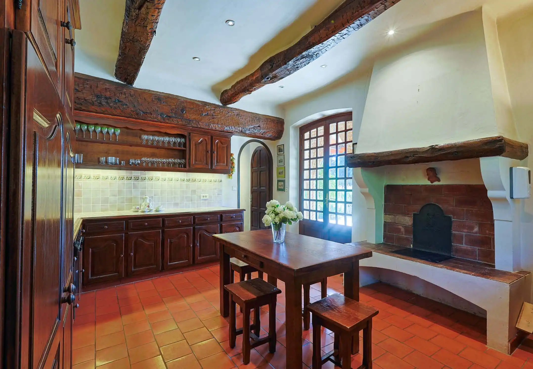 Upon entering, every detail evokes understated luxury. The gourmet kitchen, framed by stone walls and exposed beams, opens seamlessly into a sunlit dining room, creating a perfect setting for intimate meals or lively gatherings.