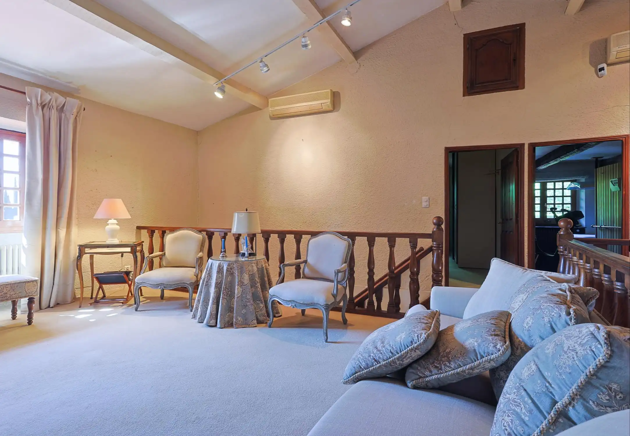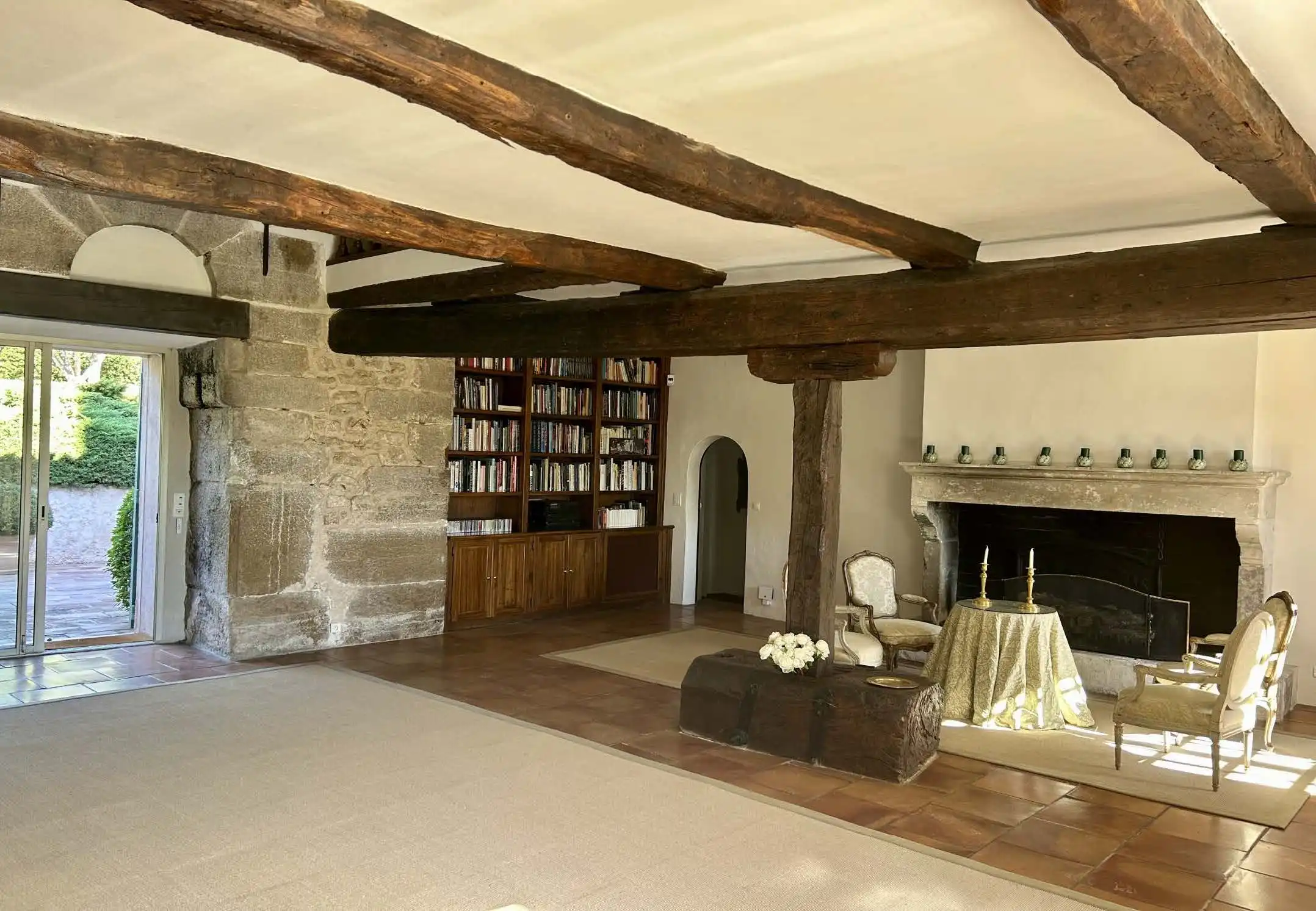The main salon impresses with its cathedral ceilings, Burgundy stone floors, and historic features, from the original oil press to the hand-hewn beams that tell of the estate’s storied past. A grand stone fireplace and bespoke library anchor the space in warmth and refinement.